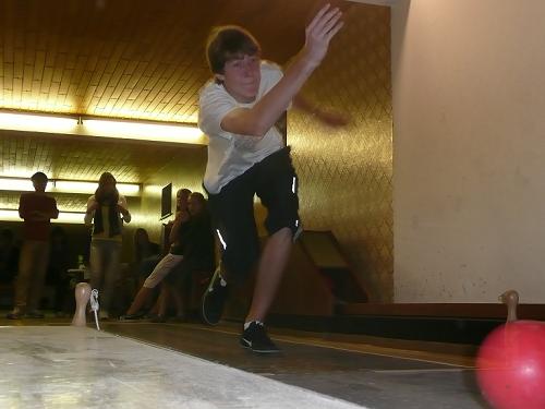 Kurz nach dem Essen stand noch eine kleine Kegeleinheit an. Los ging’s mit ein paar Einwürfen, denen dann das Pyramidenspiel folgte, bei dem es gilt, 9 x eine 1, 8 x eine 2, …, und 1 x eine 9 zu scheiben. Aufgeteilt wurden die Mannschaften nach Geburtsmonaten (Januar bis Juni und Juli bis Dezember), die optimaler Weise gleich groß und sehr ausgeglichen waren, wobei es dem zweiten Team gelang, alles bis auf die Spitze zu treffen. Aber auch alle Neune sollten an diesem Abend noch fallen; dies gelang Christian, als es in der zweiten Runde darum ging mit der falschen Hand von 199 genau auf Null zu kommen. Der entscheidende Wurf in diesem Spiel gelang Suni. Dagegen gelang dies im ersten Durchgang Tobi, dem auch noch beim „Ausschieben“ einen Kranz gelang.