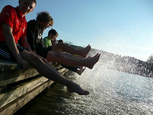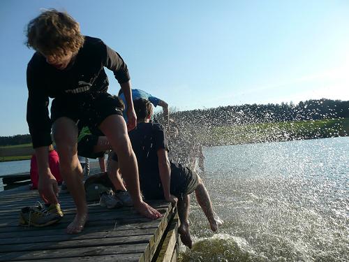 Zur Entspannung der unteren Beinmuskel entschlossen wir uns, uns am kalten See unsere Füße hineinzuhängen. Als Andi und Karin Gruppenfotos schießen wollten, artete unsere „Fotopose“ in eine wilde Planscherei aus. Anfechter war „Coach Martin“. Nach einer ausgiebigen Rangelei fielen Fabian, dann Tobi und zu guter Letzt auc hAnfechter Martin ins eiskalte Wasser.