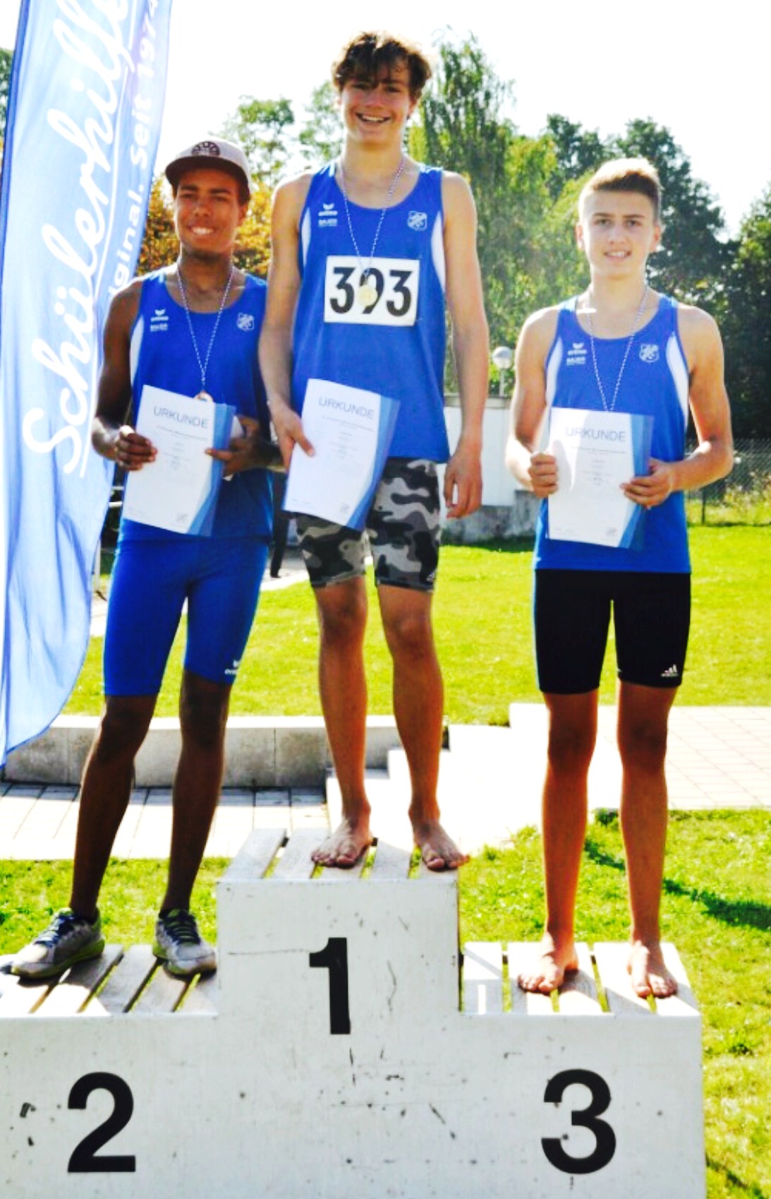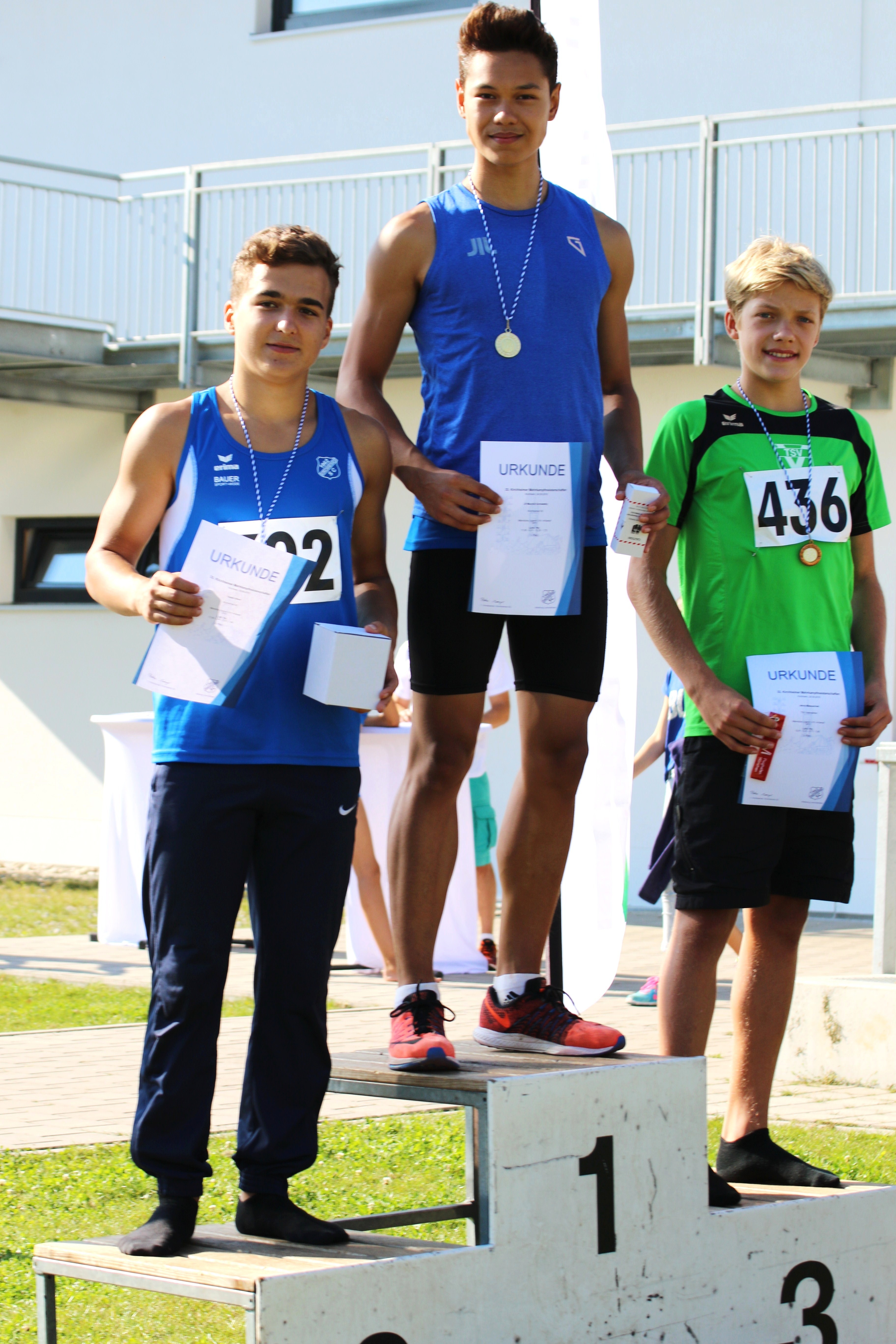 Als im letzten Monat frisch gebackener Deutscher Meister setzte Fabian OIbert über die Hürden erneut ein Ausrufezeichen. Mit 10.68 sec war er nicht nur Tagesschnellster und holte damit die maximale Punktezahl für Bayern, sondern erklomm die Spitze der deutschen Bestenliste über die 80mHürden, also jene Poleposition, welche er auch im Vorjahr bei den 14-Jährigen innehatte. Zum ersten Mal im Dreisprung an den Start gehend, bewies Jil Maurice  Gorzawsky seine Vielseitigkeit. Die geringe Vorbereitung von nur einer Woche reichte aus, dass Jil mit 12,65m im ersten und einzigen gültigen Versuch sich nicht nur den Silberrang sicherte, sondern zugleich auch den Bayerischen Meister um 19cm hinter sich lassen konnte und somit nun in der bayerischen Bestenliste Erster ist. Nach einem ersten und einem zweiten Platz und da aller guten Dinge drei sind, gab es den dritten Podestplatz, Bronze, für Vincente Graiani, der über die 800m an den Start ging. In einem sehr taktisch, verhalten geführten Rennen (1:08 min die ersten 400m) legte er noch eine starke 59er Runde drauf und sicherte weitere wichtige Punkte für Bayern.