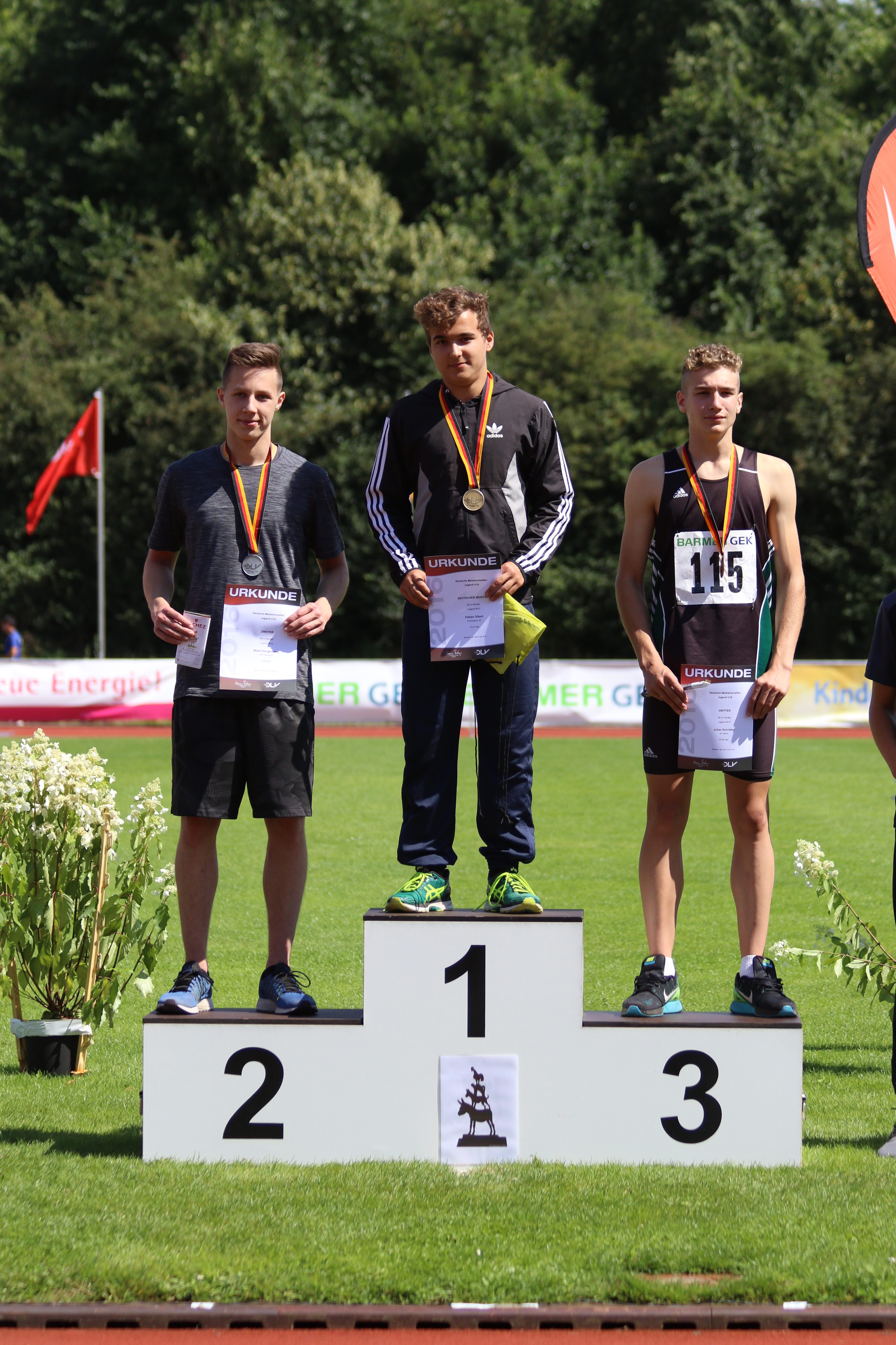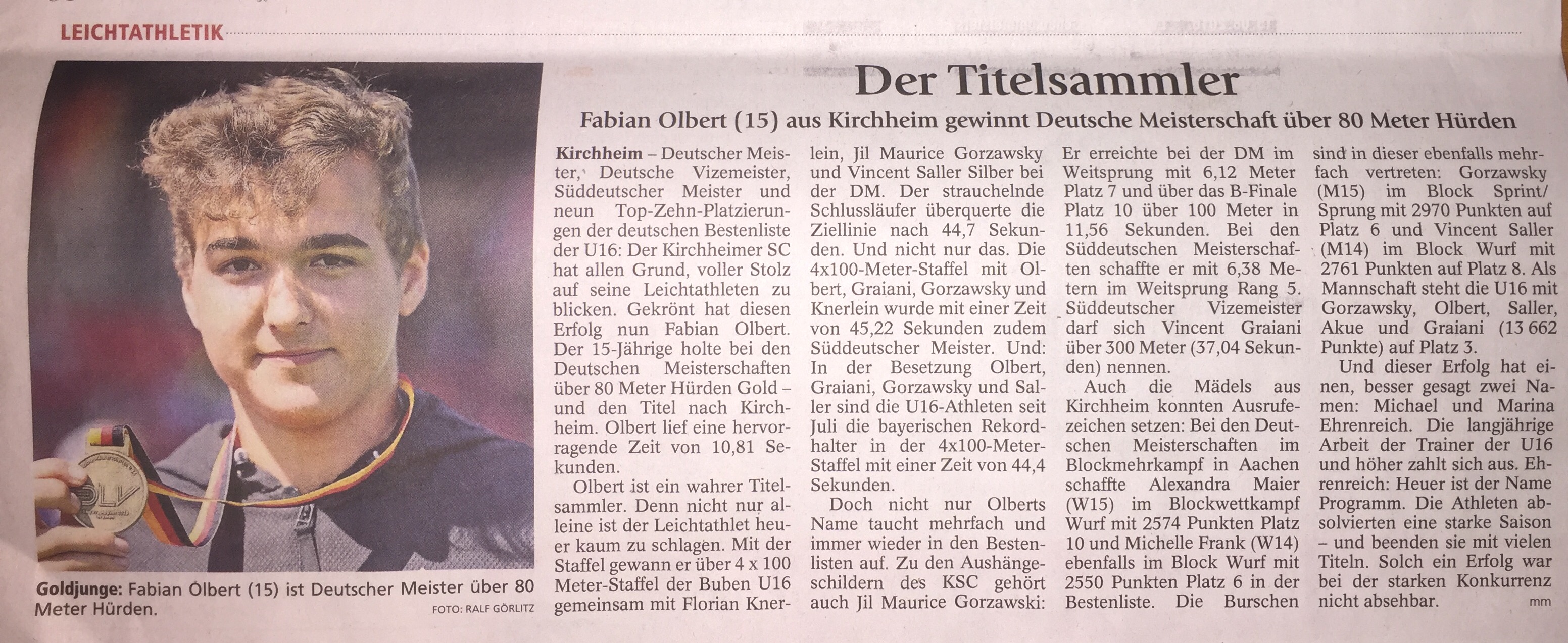 Eine sehr lange Saison endet dann doch noch vergoldet auf der Deutschen Einzelmeisterschaft der M/W15 in Bremen. Diese gab es für Fabian Olbert über die 80m Hürden bei der M15. Nachdem Medaillenträume im Blockwettkampf Wurf letztes wie dieses Jahr an der ersten Hürde zerplatzten, zeigte er, dass er nicht umsonst 2015 schnellster 14-Jähriger in dieser Disziplin war. Nach Platz 3 in seinem von vier Vorläufen, qualifizierte er sich mit einer durchwachsenen Darbietung um Haaresbreite mit 11,16 sec und nur einer Hundertstel vor dem Ranglisten- neunten für das A-Finale. Offensichtlich tat es Fabian gut, nicht als Favorit ins Rennen zu gehen und so lief er befreiter und schneller denn je über die sieben Hürden. Nach etwa 15-minütiger Ungewissheit, ob es zum Sieg gereicht hat, brachte der online Liveticker des DLVs dann die Gewissheit. Er hatte gewonnen (!!!), dicht gefolgt von Malte Stangenberg (HNT Hamburg; 10,83) und Schröder Julian (SC Berlin; 10,89). Dabei steigerte er sich gegenüber dem Vorlauf um dreieinhalb Zehntel und verbesserte seine zwei Wochen alte Bestleistung ebenfalls um ein Zehntel auf starke 10,81 sec.