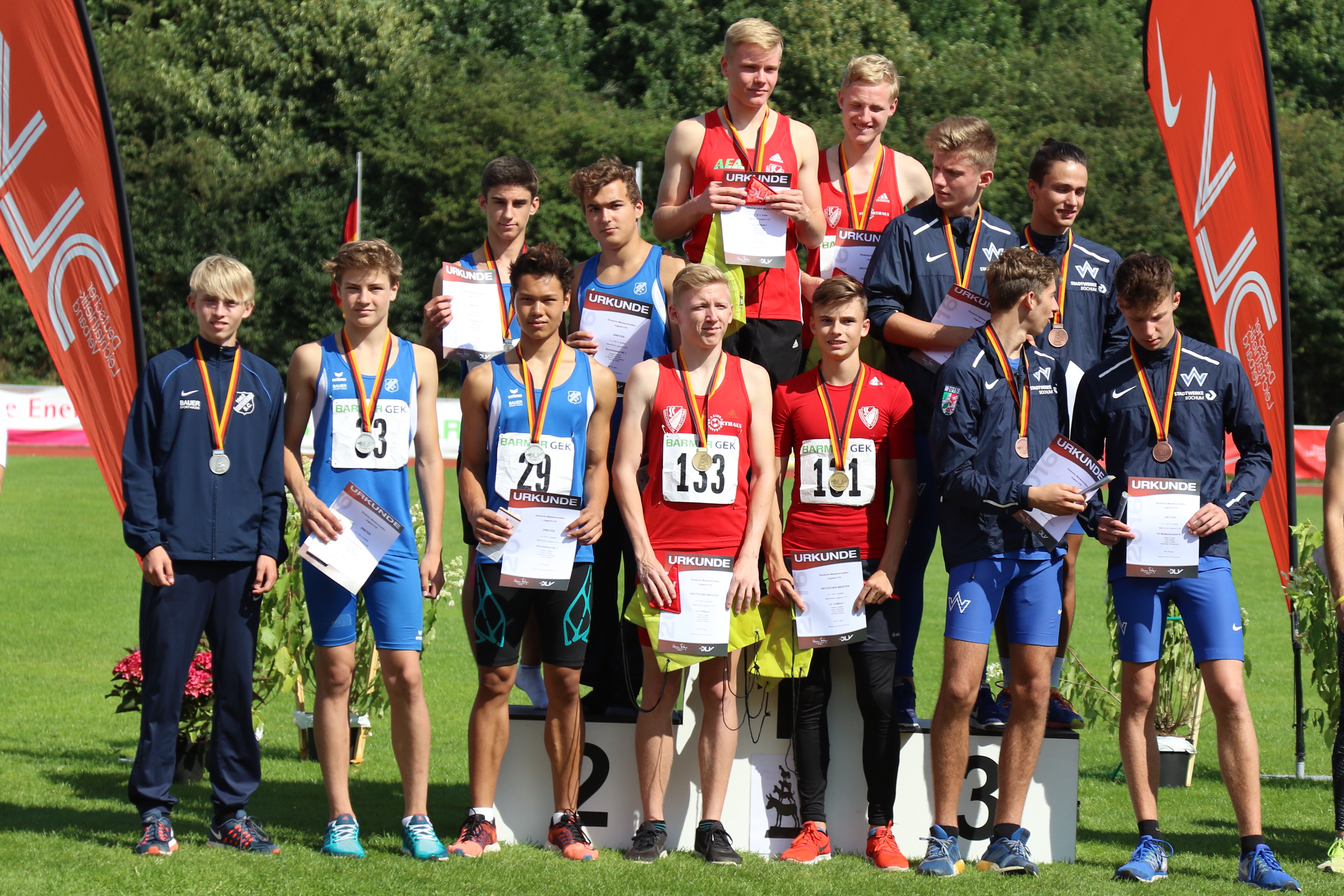 Aber das sollte nicht die einzige Medaille des Tages bleiben. Mit der Staffel, die am Vortag ihren Vorlauf in der Besetzung Fabian Olbert, Vincente Grainai, Florian Knerlein und Vincent Saller für sich entscheiden konnten (siebtschnellste Zeit; 45,61 sec) und sich direkt für’s Finale qualifizierten, gab es weiteres Edelmetall! Nachdem Vincente Graiani verletzungsbedingt leider ausfiel und auch auf seinen Einzelstart verzichten musste, komplettierte nun Jil Maurice Gorzawsky das Quartett (Olbert, Knerlein, Gorzawsky, Saller). Nach drei sehr guten Läufen und Übergaben rettete Vincent den Vorsprung noch zu Silber (44,70 sec) hinter der LC Cottbus (44,31) und dem TV Wattenscheid 01 (44,79) ins Ziel. Für Vincente gab es zum Trost für die verpassten Finalteilnahmen eine Einladung zu einem Sichtungslehrgang des DLVs.