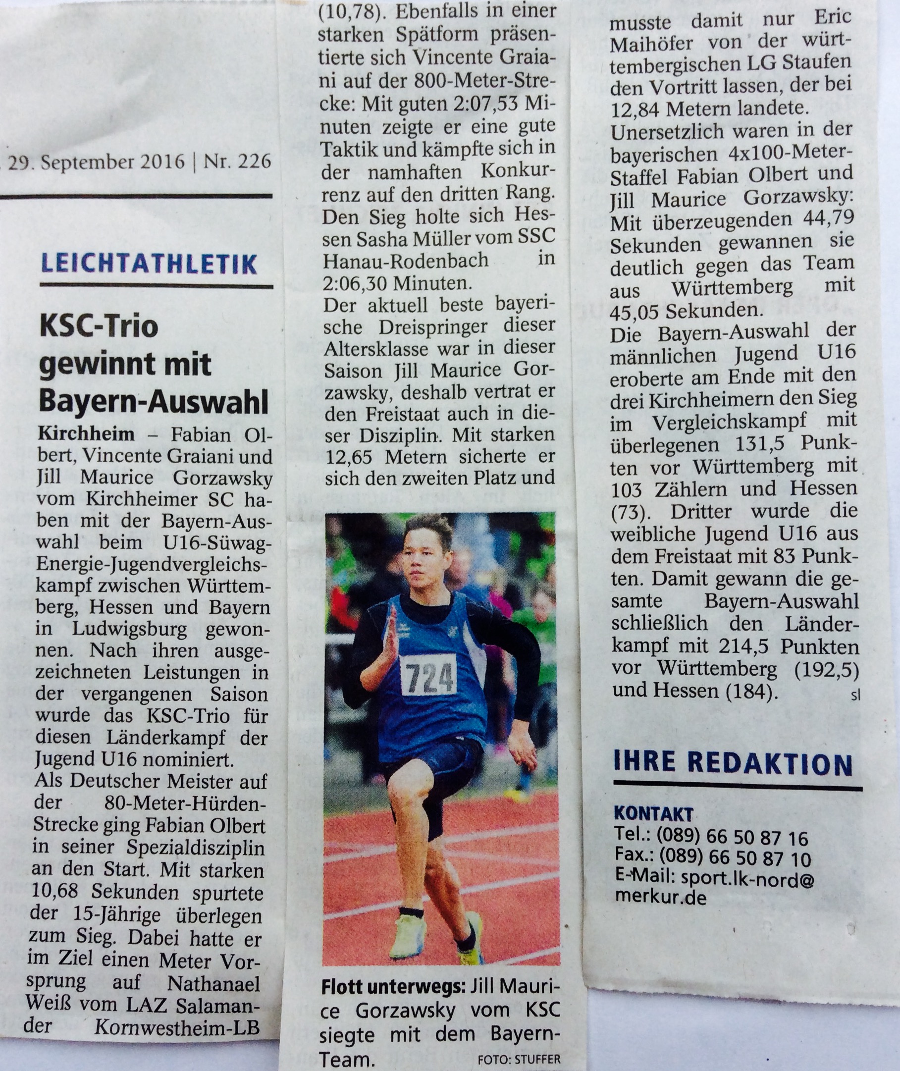 Nach den Sommerferien stehen traditionell der Vergleich der sieben bayerischen Bezirke sowie der Ländervergleich gegen Baden-Wüttemberg und Hessen an. Im Vergleich zum Vorjahr konnte dabei die Zahl der teilnehmenden KSC-Athleten deutlich gesteigert werden. Trat letztes Jahr nur Fabian Olbert als einziger Kirchheimer für Oberbayern an, so wurden dieses Jahr 7 Athleten der U16 in die Auswahlmannschaften berufen.