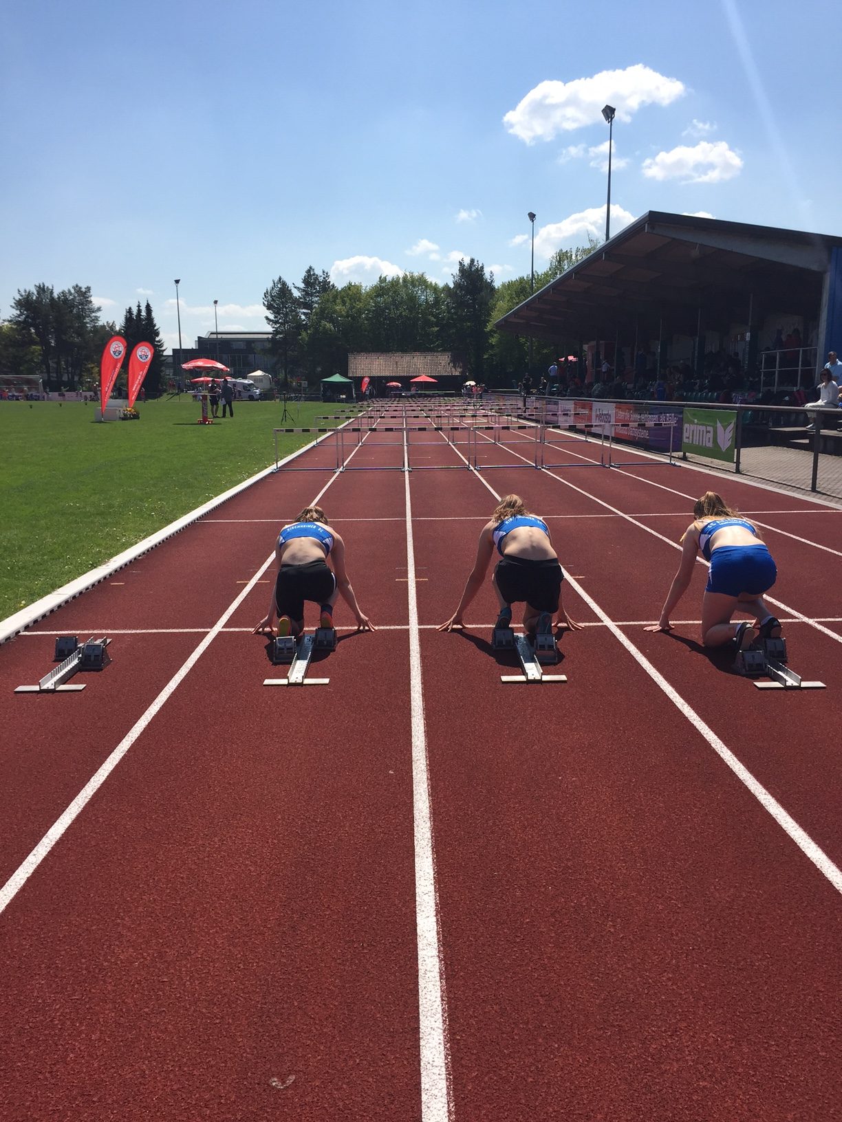 So lieferten Michelle und Alex bei weniger guten Bedingungen am 1.5. in Wasserburg einen sensationellen ersten Blockwettkampf Wurf ab. Alex steigerte ihre Hürdenbestzeit auf 12.50s, ließ den Diskus auf 24.23m segeln, sprintete in guten 13.56s die 100m, kam im Kugelstoß auf 10.96m und sprang im abschließenden Weitsprung bei Regen noch solide 4.85m. Diese Leistungen verschafften ihr 2552 Punkte, womit sie die deutsche Quali gleich in der Tasche hatte. Michelle tat es ihr gleich und lief in ihrem ersten Hürdenlauf gleich extrem starke 12.52s, erzielte im Diskuswurf mit 18.77m eine neue Bestleistung, erreichte in ihrem ersten 100m-Rennen eine richtig gute Zeit von 13.03s, wuchtete die Kugel auf 7.93m und sprang tolle 4.91m Weit. Am Ende standen 2413 Punkte auf ihrem Konto, womit sie auch die geforderte Norm übertraf. Vanessa (U18) absolvierte an diesem Tag die Disziplinen des ersten Siebenkampftages. Leider war sie erst nachmittags dran als die Wolken den Regen nicht mehr zurückhalten wollten. Zum ersten Mal über die 100m Hürden-Distanz unterwegs, beendete sie ihren Lauf in 16.63s. Über die 100m Distanz sprintete sie in 13.37s, erreichte im unter Wasser stehenden Ring beim Kugelstoßen eine tolle neue Bestleitung von 8.02m und sprang abschließend im strömenden Regen sehr gute 1.46m hoch. Nathalie bestritt den ersten 800m-Lauf ihrer jungen Karriere in 2:46,31 und das erste was sie im Ziel sagte, war „ich will bald wieder laufen!“
