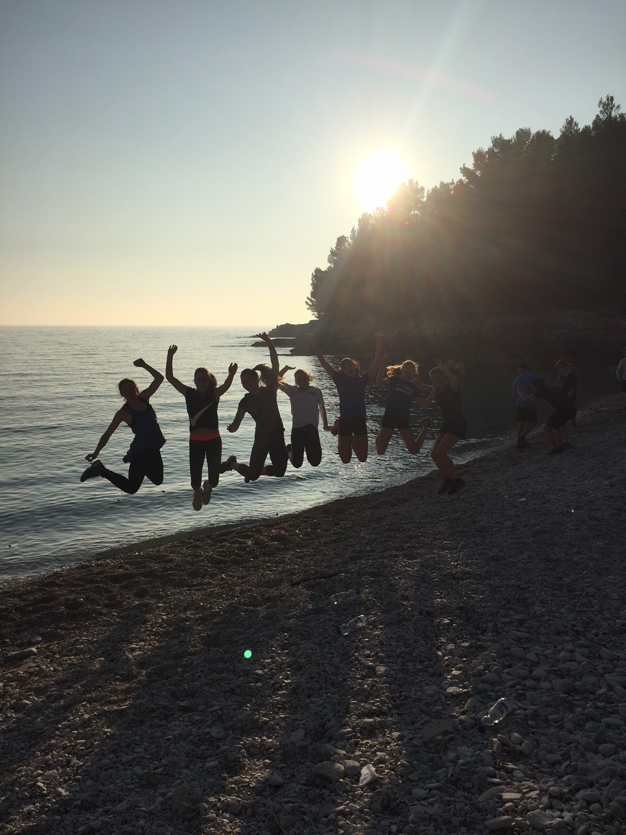 so gut das Wetter auch war, so schlecht waren wir in der ersten Trainingseinheit im Hochsprung. Das haben wir dann aber zum Glück mit der zweiten Trainingseinheit am Nachmittag wieder ausgeglichen, indem wir dies wieder mit Dreisprung und Kugel rausgerissen haben. Zum Wohle unserer Trainerin, deren Nerven durch Hochsprung ziemlich ausgereizt worden sind. In der Mittagspause zwischen den Trainingseinheiten haben wir dann den Würfel entscheiden lassen, was wir machen. Und er hat sich – welch Wunder – für den Strand entschieden, trotz des kühlen Windes. Deshalb haben wir uns alle warm eingepackt. Aber in der Bucht haben wir dann, nachdem wir die Klippen mutig erklommen haben, ein windstilles Plätzchen gefunden. Da wir hier leider kein Prosieben haben und Donnerstag kein GNTM schauen können, fand in der Bucht gleich das erste Fotoshooting statt. Natürlich haben alle ein Foto bekommen! Aufgrund des überraschend schönen Wetters, nahmen wir gleich ein Sonnenband und luden unseren Vitamin-D Gehalt auf. Sonne, Strand, wunderschönes Meer, Musik, Traubenzucker 😉 und tolle Leute – Was will man mehr?