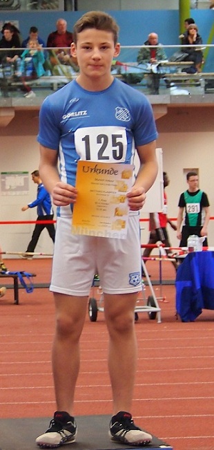 Matthias qualifizierte sich über die 60 m mit einer Zeit von 8,30 sec. für den Endlauf und verbesserte seine Zeit im Finale auf 8,26 sec, was den Sieg bedeutete. Über die 60 m Hürden war er in 10,74 sec. der Schnellste und beim Weitsprung setzte er gleich im ersten Sprung mit 4,72 m eine Marke, die keiner  der 16 Konkurrenten knacken konnte. Sein 4. Gold holte er sich bei der 4 x 60m-Staffel zusammen mit Daniel Maier, Fabian Olbert und Tim Öchsle. Unsere Jungs ließen der Konkurrenz nicht den Hauch einer Chance und siegten in 35,85 sec. mit deutlichen Abstand. Erst beim Kugelstoßen fand Matthias seinen Meister und wurde mit einer Weite von 9,0 m Zweiter.