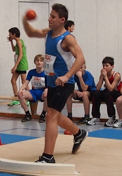 Tim Öchsle (M13) überzeugte neben dem 5er-Hopp (s. oben) mit durchweg guten Leistungen auch im Kugelstoßen (7,56 m, Pl.2), beim 35m-Hürdensprint (6,76 sec./Pl. 5) und über die 35 m flach (5,74 sec/Pl. 3 ).