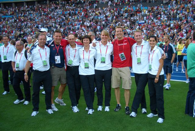 Nachdem alle Wettkämpfe vorüber waren, gab es noch einen Einzug aller Volunteers, bei dem dieses Fotos mit den amerikanischen Betreuern entstand.