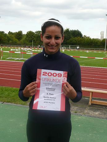 Die Reise zu den Deutschen Mehrkamfmeisterschaften vom 28.08.-30.08.09 in Lage waren für die Kirchheimerin Sunita Kumar (Jg. 89) ein voller Erfolg. Mit ihrer besten Platzierung, dem achten Platz, auf einer Deutschen Meisterschaft trat Sunita nach zwei Tagen und sieben Disziplinen die Heimreise wieder an.