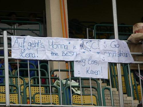 Nachdem drei von vier Mädels für die Staffel verletzungs- bzw. krankheitsbedingt ausfielen, fiel auch die 4x100m Staffel der Schülerinnen A buchstäblich ins Wasser. Auch wenn Valentina Renner (W14) somit nicht mehr zum Einsatz kam, erfreute und motivierte sie die Kirchheimer Nachwuchsathleten mit ihren gestalteten Transparenten (s. Bild).